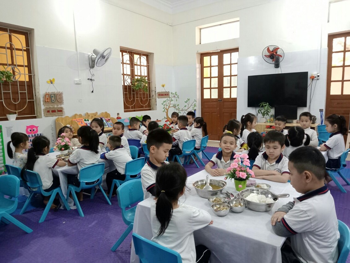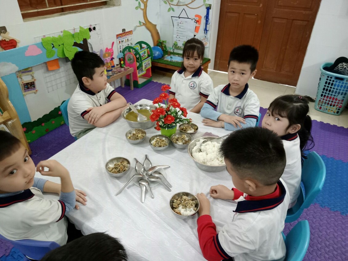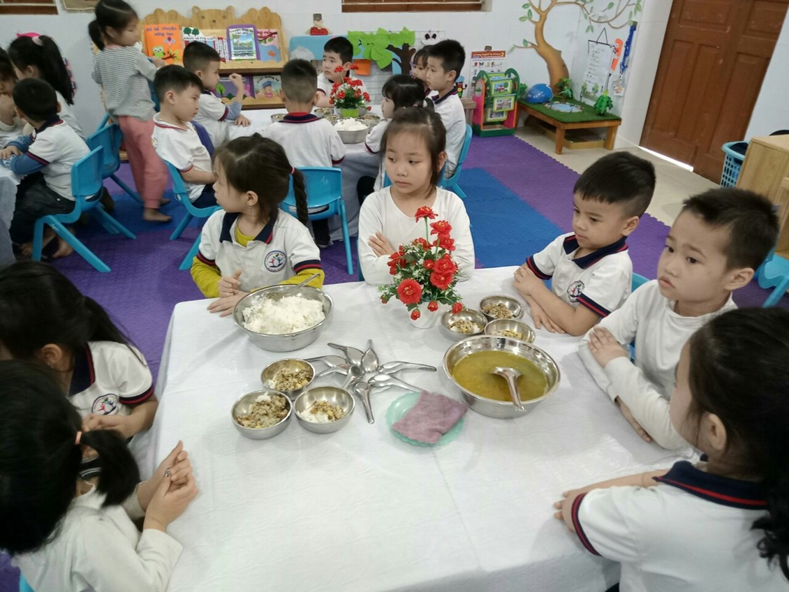 Trước khi ăn nhắc trẻ mời và cầm thìa bằng tay phải. Trong khi trẻ ăn cô tạo không khí vui vẻ, tùy từng tình hình cụ thể để áp dụng các phương pháp khác nhau như tạo một cuộc thi đua, gửi lời khen tới những bạn ăn hết suất.... để tạo bầu không khí vui vẻ trong bữa ăn, giúp trẻ có hứng thú hơn và đặc biệt là ăn hết suất của mình.