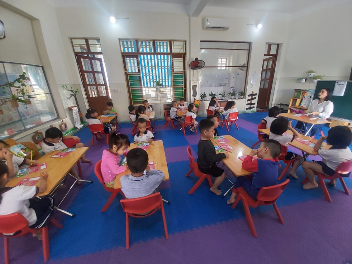 Các bạn nhỏ đang chăm chú tập tô nét sổ thẳng