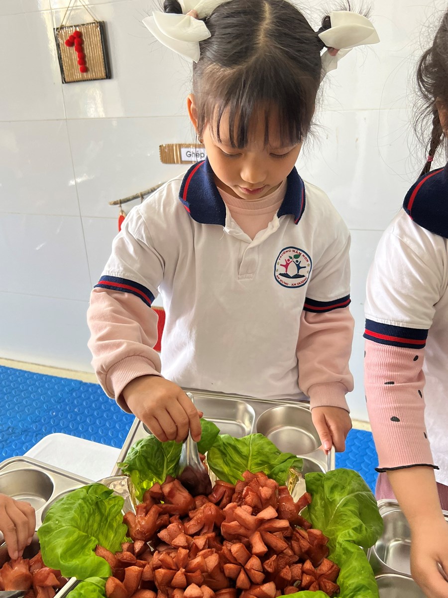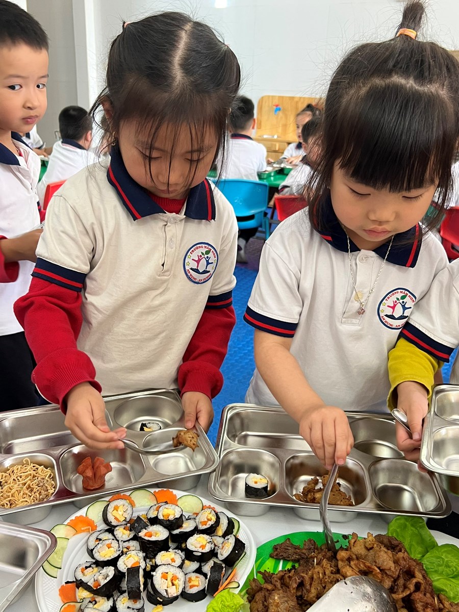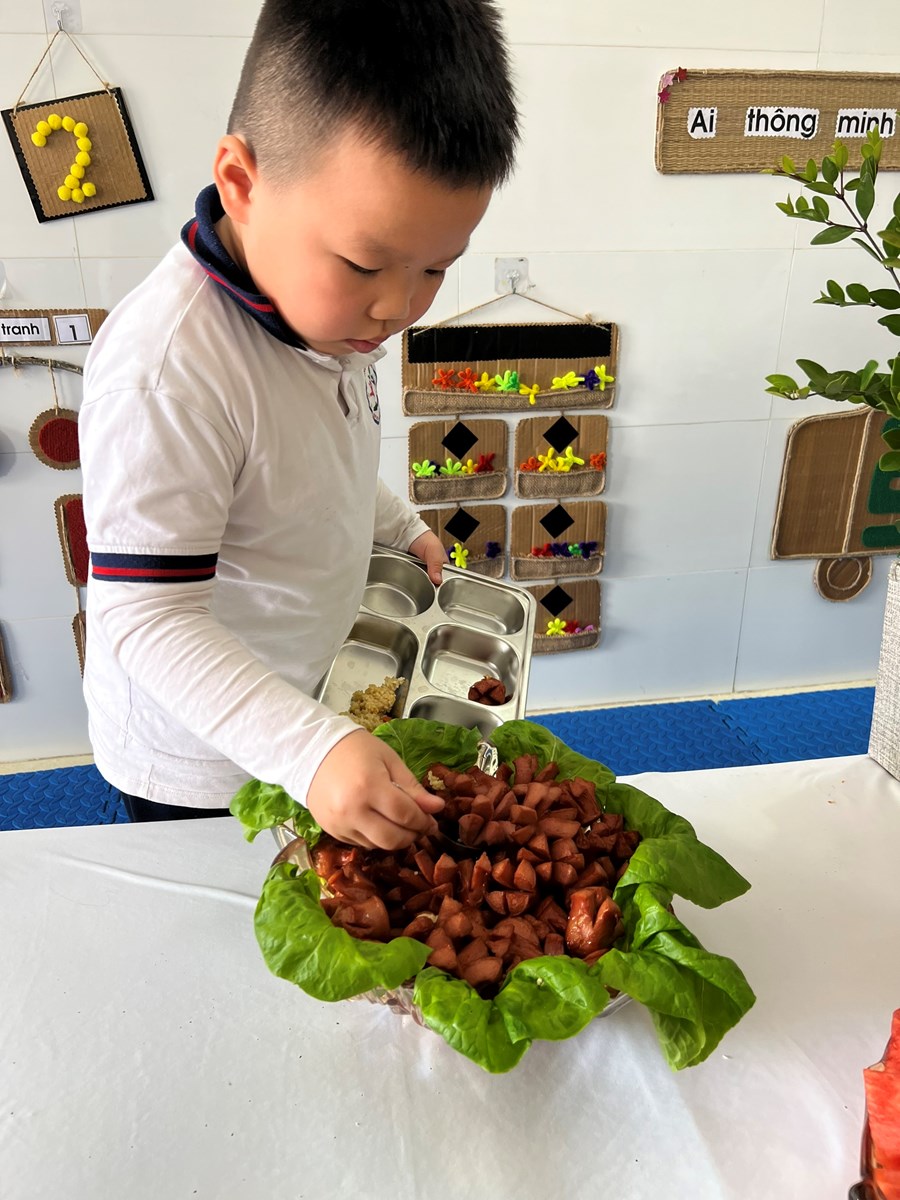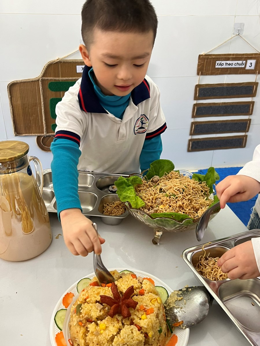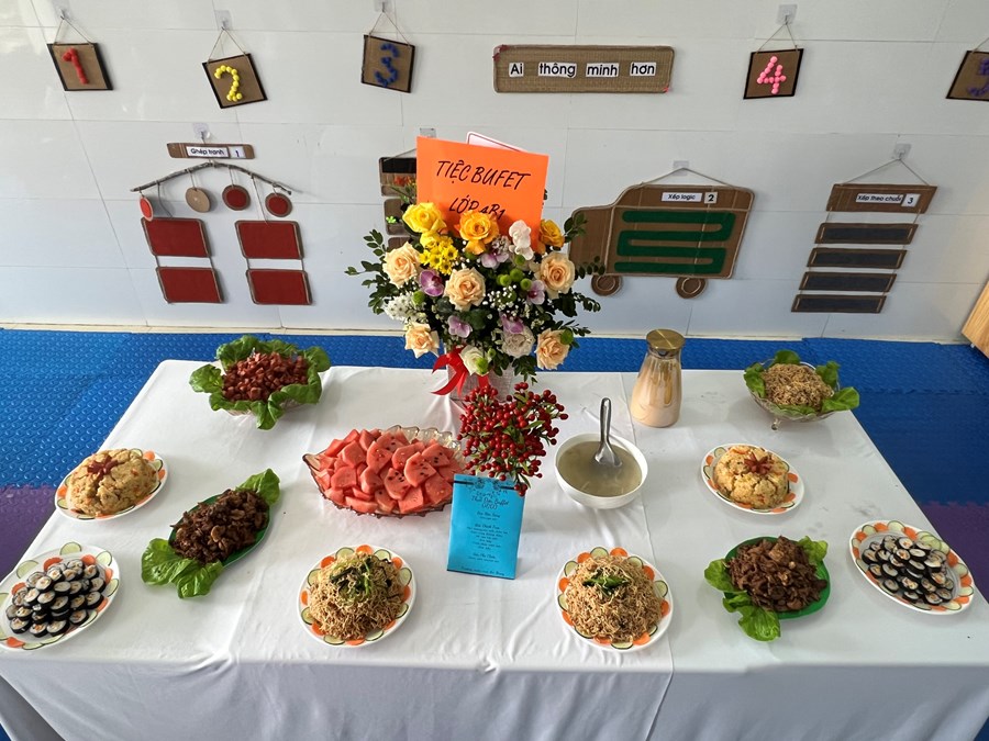 Việc tổ chức cho trẻ ăn buffet là một trong những hoạt động thiết thực, hiệu quả nhằm tạo dựng cho trẻ những kỹ năng sống cần thiết ngay từ khi còn nhỏ. Thông qua việc này rèn luyện cho trẻ tính nhẫn nại và sếp hàng đợi tới lượt mình, cho trẻ được tiếp xúc với những nền văn hóa mới. Hơn nữa, tổ chức cho trẻ ăn buffet còn giúp trẻ giao lưu, trao đổi trò chuyện với nhau về các món ăn, cách ăn, cách sử dụng đồ. Qua đó dạy trẻ thói quen tự phục vụ, tự lựa chọn giúp trẻ thêm mạnh dạn, tự tin giao tiếp, ứng xử tạo tiền đề cho sự phát triển của trẻ một cách toàn diện. Dưới đây là một số hình ảnh trong bữa tiệc Buffet của các bé lớp 4B1: