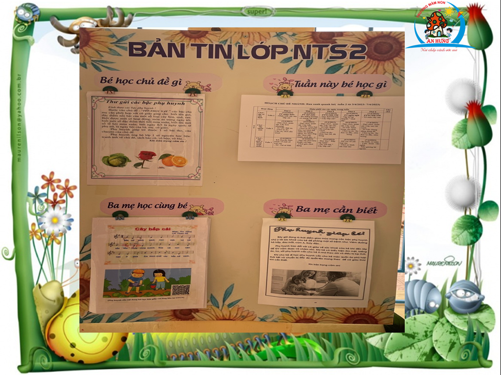 Với lớp nhà trẻ số 2 hàng ngày giờ đón trẻ trẻ giáo viên luôn quan tâm trao đổi phối kết hợp cùng phụ huynh để cùng chăm sóc giáo dục trẻ. Không chỉ vậy giáo viên còn luôn đưa đầy đủ, kịp thời các nôị dung tuyên truyền lên bảng tuyền truyền ở cửa lớp và cả bảng tuyên truyền dưới sân để phụ huynh nắm bắt được và cùng phối hợp chăm sóc giáo dục trẻ đạt kết quả tốt nhất.
