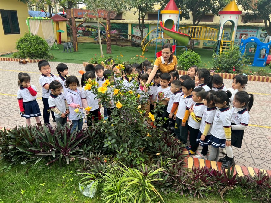 Các bé lớp NTS3 cùng quan sát tìm hiểu về cây hoa ngũ sắc
