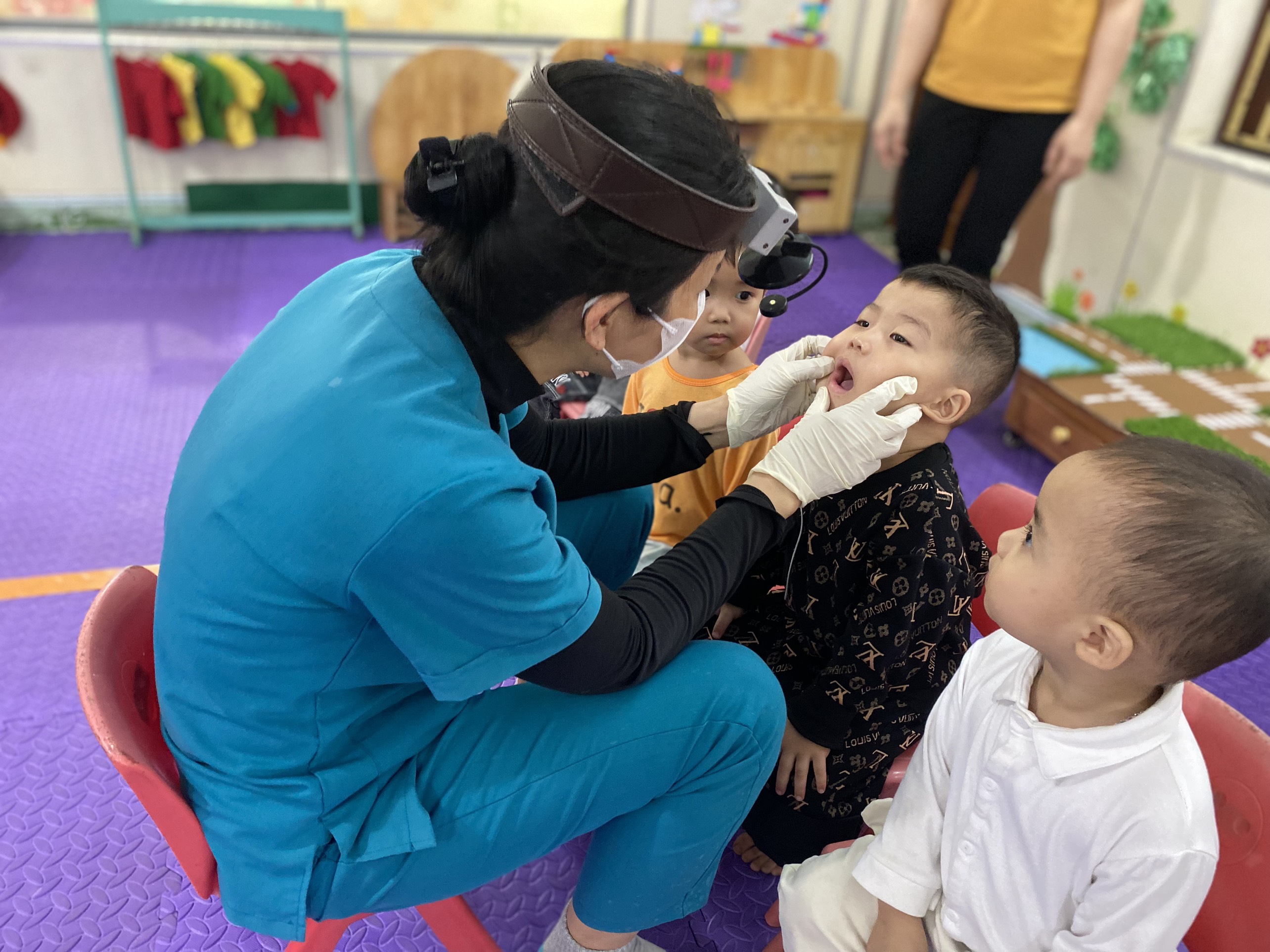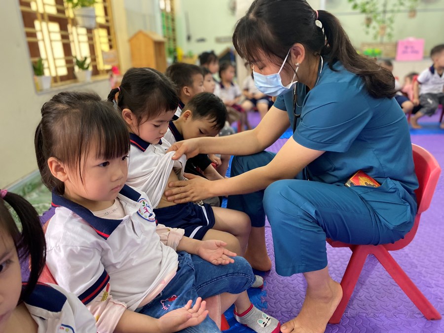 Từ nhiều năm nay, việc tổ chức khám sức khoẻ định kỳ cho trẻ đã được nhà trường duy trì thành nề nếp thực hiện thường xuyên theo kế hoạch năm học. Ngày 12/4/2023, nhà trường đã phối hợp với trạm y tế xã tổ chức khám sức khỏe định kỳ cho 100% các cháu trong nhà trường với các nội dung kiểm tra: Cân nặng, chiều cao, khám tai, mắt, mũi, họng, kiểm tra tim phổi và một số bệnh liên quan đến đường hô hấp, da liễu ...