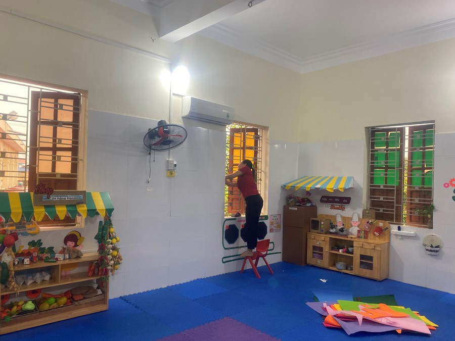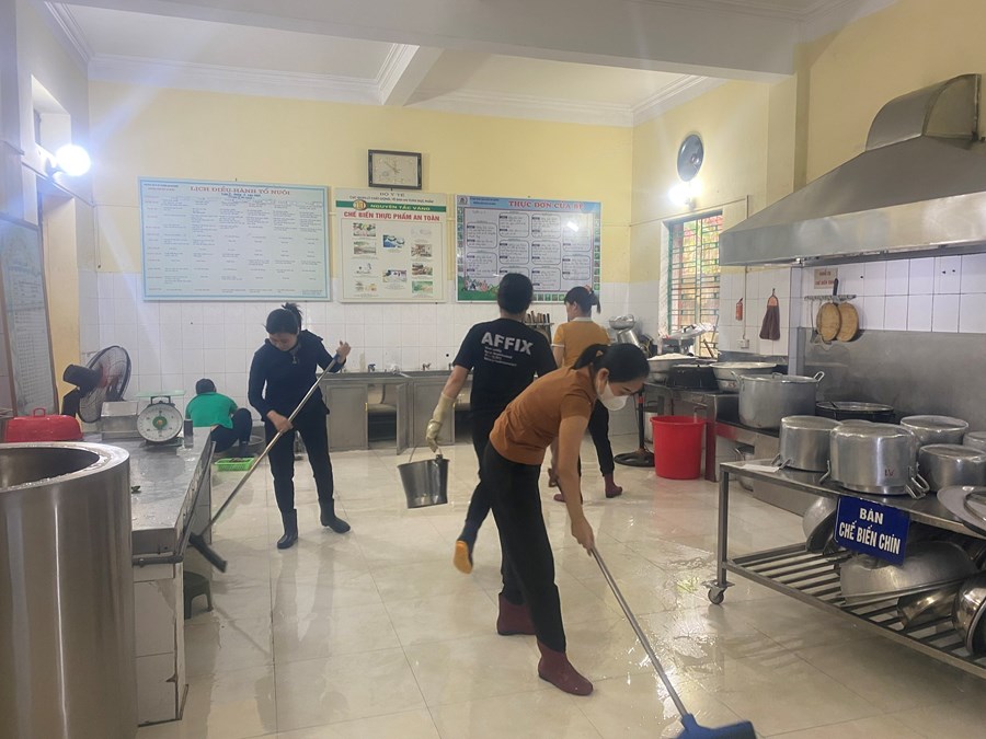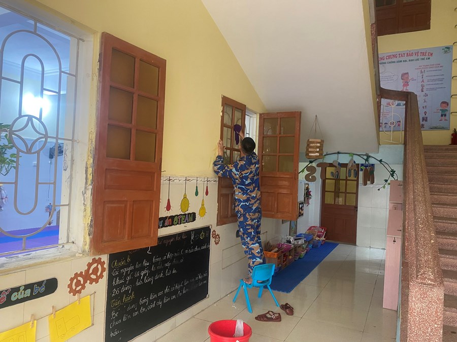 Bên cạnh đó GVNV tích cực thực hiện tốt công tác vệ sinh môi trường trường lớp, các TB-ĐDĐC, các cô nuôi cẩn thận tráng bát, thìa... bằng nước sôi của trẻ trước khi cho vào tủ sấy; trong công tác tổng vệ sinh nhà trường được các đ/c của Chi đoàn Đại đội 1 - Tiểu đoàn Phòng hóa 20 đóng trên địa bàn nhiệt tình đến giúp đỡ.