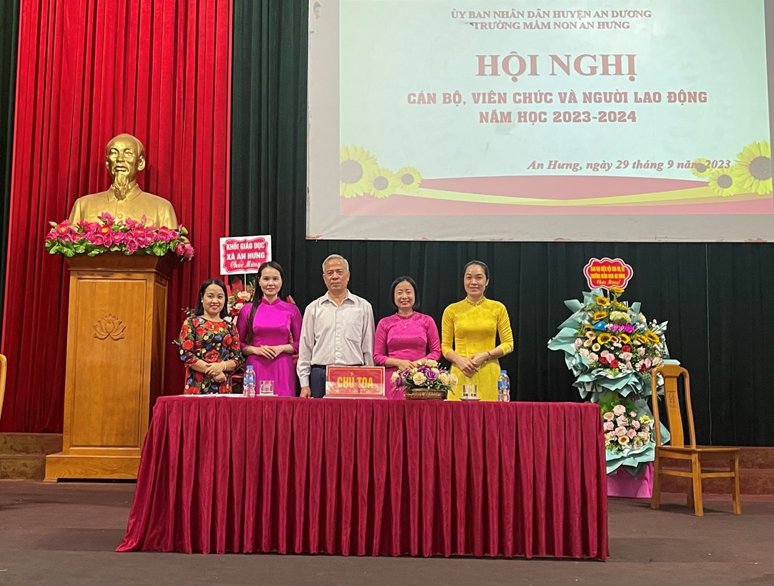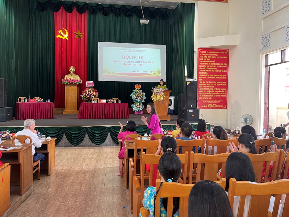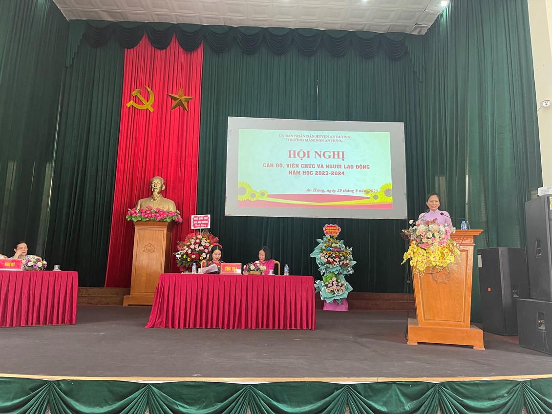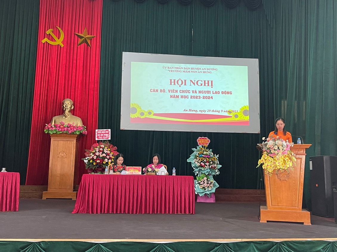 Đồng chí Nguyễn Thị Huyền - Phó Trưởng phòng GD&ĐT huyện, cùng đồng chí Nguyễn Thị Hằng - Phó Chủ tịch UBND xã An Hưng thay mặt lãnh đạo Phòng GD&ĐT, địa phương phát biểu chỉ đạo Hội nghị. Các đồng chí ghi nhận và nhiệt liệt biểu dương những thành tích, kết quả mà trường Mầm non An Hưng đạt được trong năm học vừa qua. Đồng thời nhấn mạnh một số nhiệm vụ trọng tâm có tính định hướng, gợi mở để cán bộ, viên chức, người lao động nhà trường nghiên cứu, tập trung thực hiện: