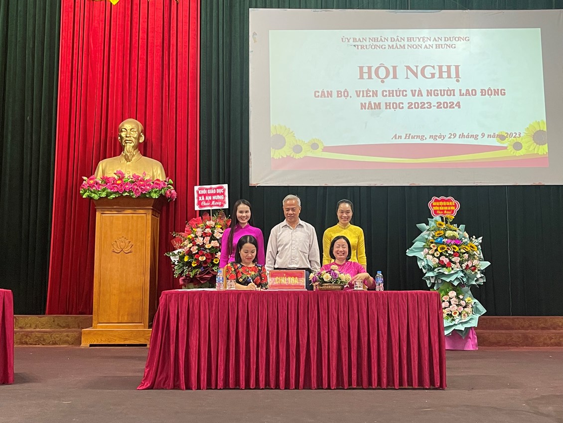 Sau thời gian làm việc với tinh thần khẩn trương, nghiêm túc, Hội nghị cán bộ, viên chức, người lao động năm học 2023-2024 của trường Mầm non An đã thành công tốt đẹp. 100% cán bộ, viên chức, người lao động đã biểu quyết thông qua các chủ trương, giải pháp chính và các chỉ tiêu quan trọng của năm học mới thể hiện tinh thần quyết tâm cao, cùng nhau đoàn kết, thực hiện thắng lợi nhiệm vụ năm học 2023-2024 và các năm tiếp theo./.
