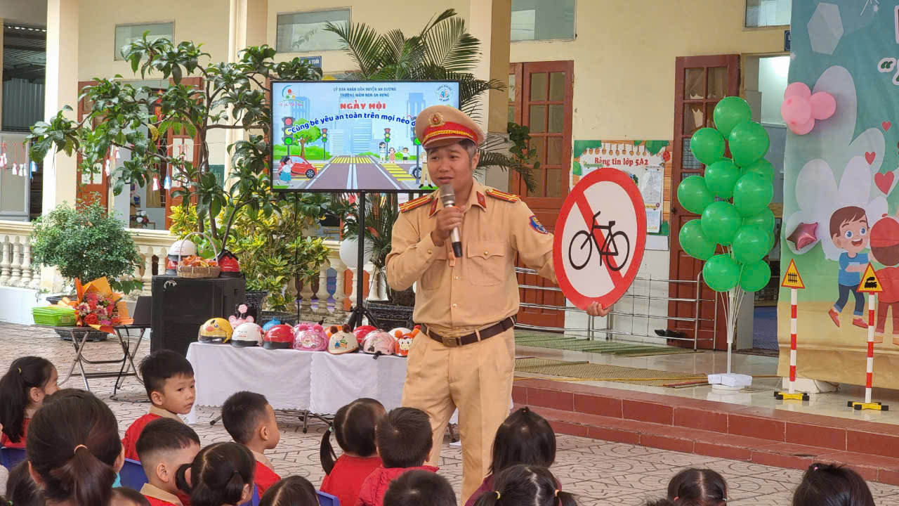 Tại ngày hội, Thiếu tá Nguyễn Minh Tuấn - Trạm phó trạm Cảnh sát giao thông An Hưng đã hướng dẫn các bé nhận biết và phân biệt các loại biển báo giao thông, cách lựa chọn và đội mũ bảo hiểm đúng cách để đảm bảo an toàn khi di chuyển bằng phương tiện giao thông. Đặc biệt, các bé còn được học cách nhận biết một số hành vi đúng và sai khi tham gia giao thông, nhận biết một số cách thoát hiểm khi không may bị bỏ quên trên xe ô tô. Qua các bài học thực tiễn và sinh động, các bé đã hiểu rõ hơn về cách giữ an toàn và tự bảo vệ mình trong các tình huống nguy hiểm.