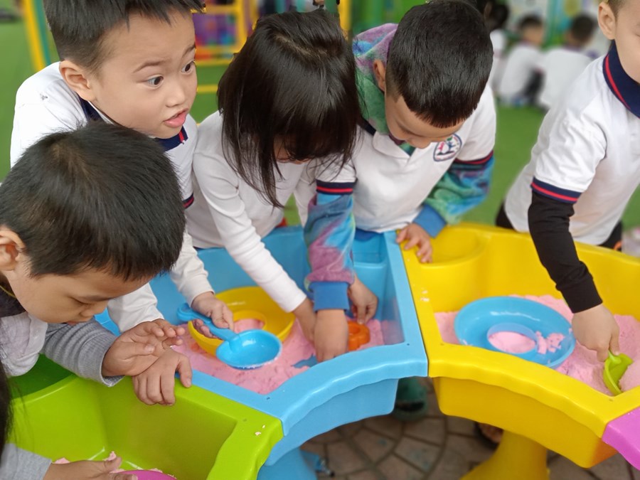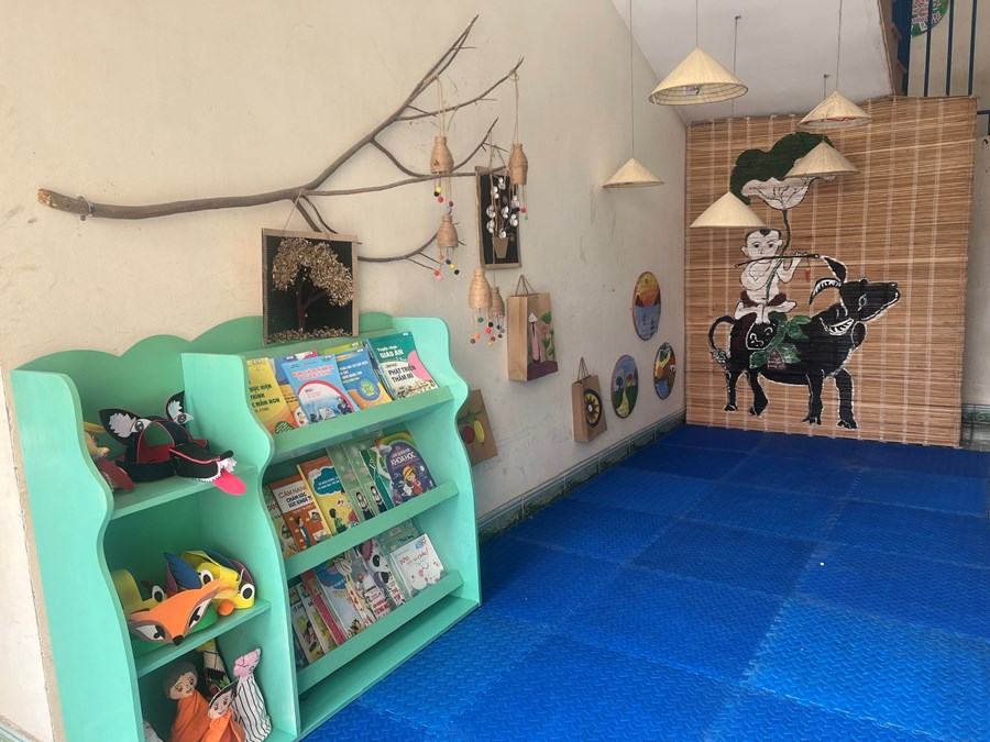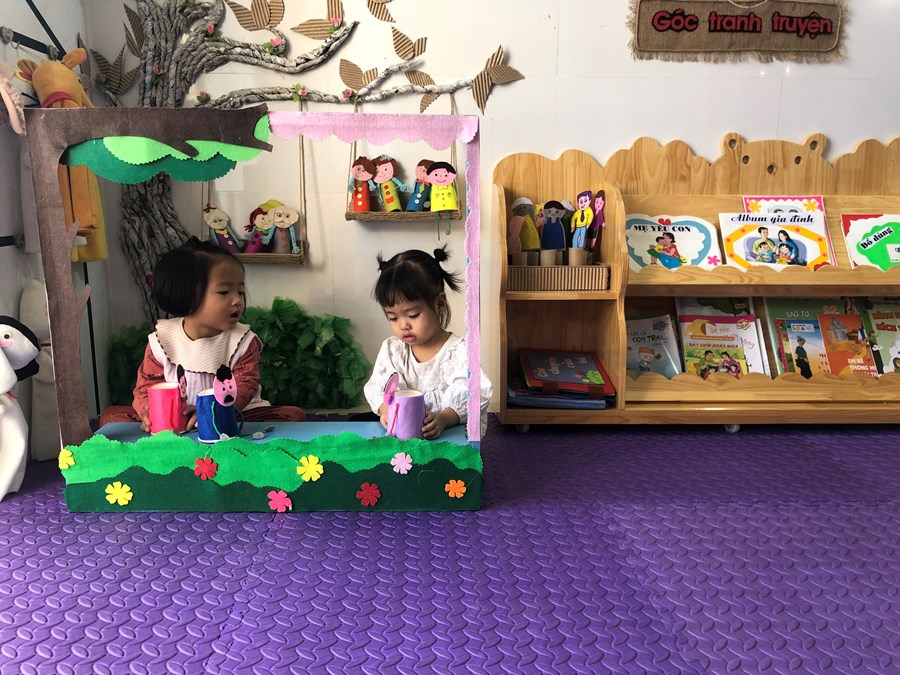 Đối với Góc thư viện, trẻ được trải nghiệm làm sách tranh, làm album về các chủ đề. Góc bé vui khám phá, trẻ được trải nghiệm chơi với nước, cát, hạt muồng muồng, từ đó bé được khám phá được nhiều điều mới lạ.