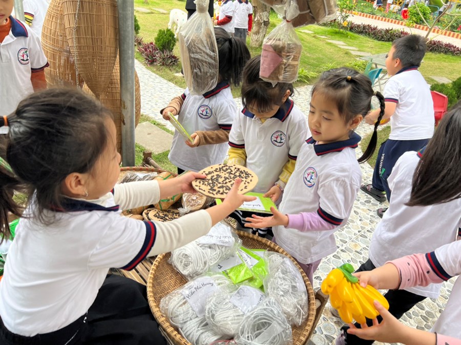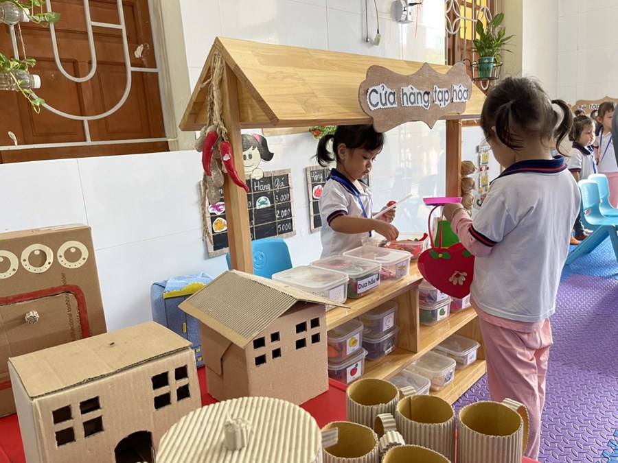 Đối với trẻ mầm non, môi trường ngoài lớp học là yếu tố góp phần tích cực trong các hoạt động nâng cao chất lượng chăm sóc giáo dục toàn diện cho trẻ. Để tạo cho trẻ có nhiều cơ hội được tham gia các hoạt động trải nghiệm thực tế, nhà trường cần sắp xếp các khu vực chơi với đất, cát, nước, đá, sỏi..., cho trẻ hoạt động trải nghiệm vật chìm, nổi, đóng khuôn, đong nước, pha màu... tận dụng tối đa cơ hội cho trẻ được trải nghiệm với các thiết bị trên sân. Bên cạnh đó cần xây dựng các gian hàng chợ quê, góc thư viện, góc bé vui khám phá cho trẻ hoạt động. Với góc chợ quê giáo viên có thể tổ chức các hoạt động ngoại khóa như “Ngày hội quê em”, trẻ được trải nghiệm mua và bán hàng qua đó tạo cơ hội cho trẻ giao tiếp và phối hợp nhịp nhàng giữa cô và trẻ, giữa trẻ với trẻ nên hiệu quả các hoạt động có chất lượng cao hơn, trẻ yêu trường, yêu lớp, yêu cô giáo, biết quan tâm đến bạn bè, có kỹ năng và tự tin trong giao tiếp.