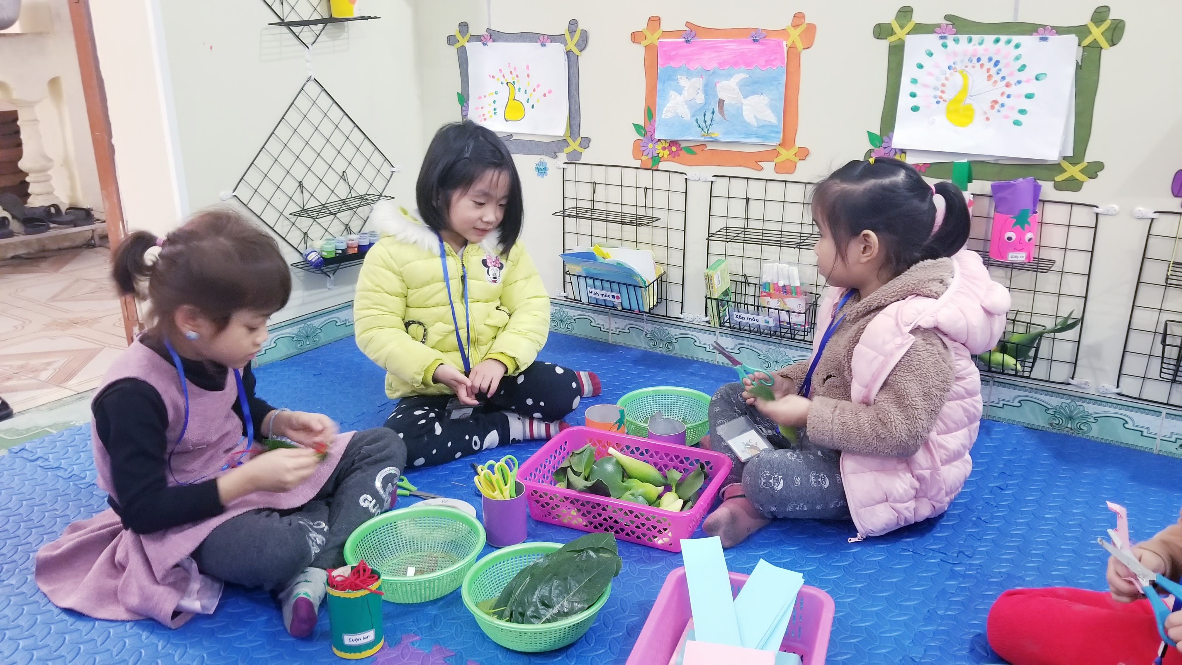 Các bé lớp 5A1 đang làm đồ chơi từ các nguyên học liệu