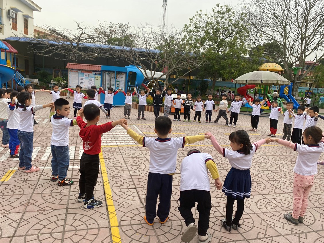 Hoạt động ngoài trời với 3 nội dung: Quan sát các sự vật, hiện tượng thiên nhiên ở môi trường xung quanh sau đó cùng cô giáo và các bạn tham gia chơi trò chơi vận động có luật ở trên sân trường, cuối cùng lớp sẽ được chơi ở các khu vực chơi như: Khu vui chơi thể chất, khu khám phá thử nghiệm, khu chợ quê, khu các trò chơi dân gian, khu vực sân khấu, khu vực sân bóng.