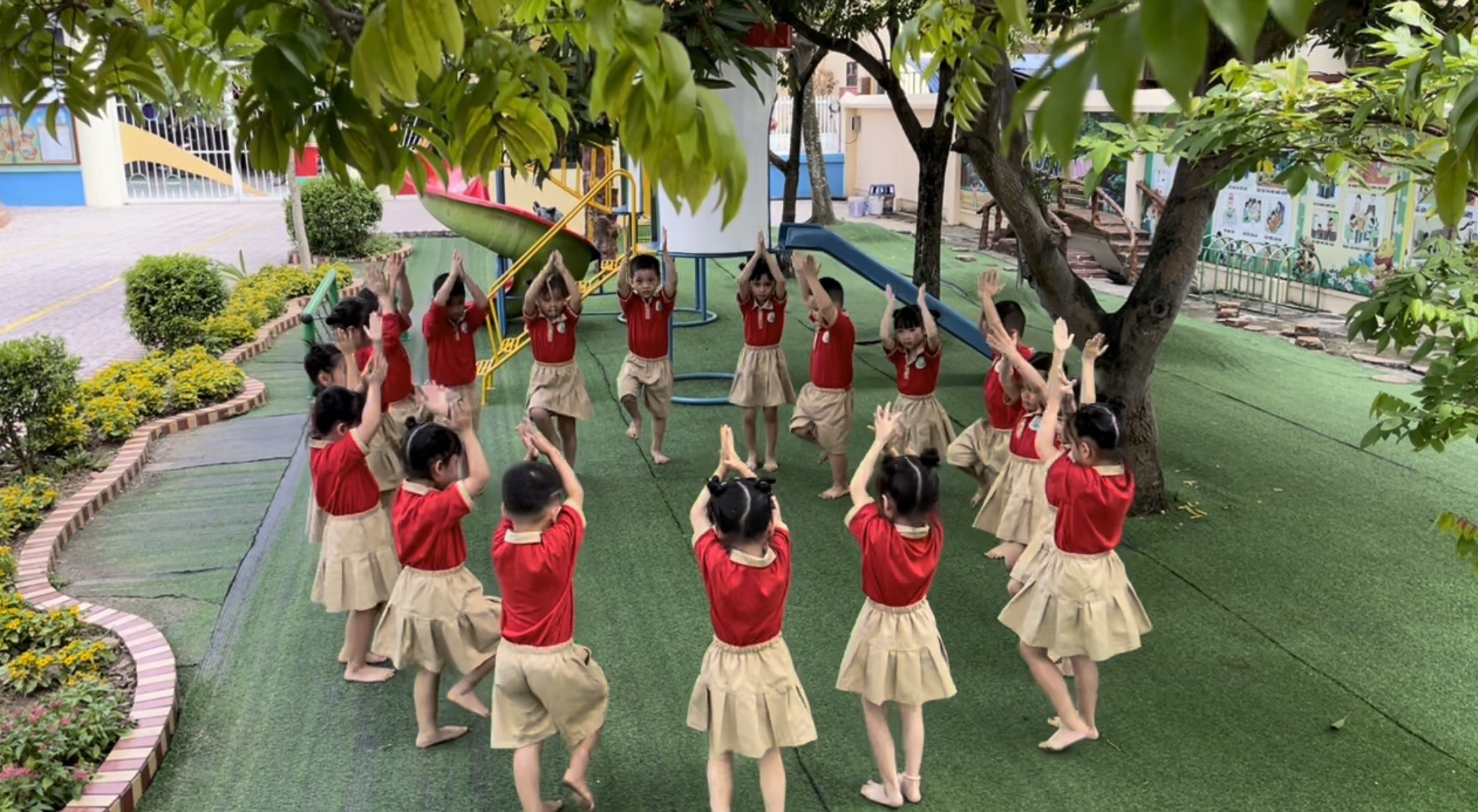 - Đứng tại chỗ tập động tác: Vỗ 2 tay trên cao kết hợp nhấc cao chân khởi động kết hợp nhạc.