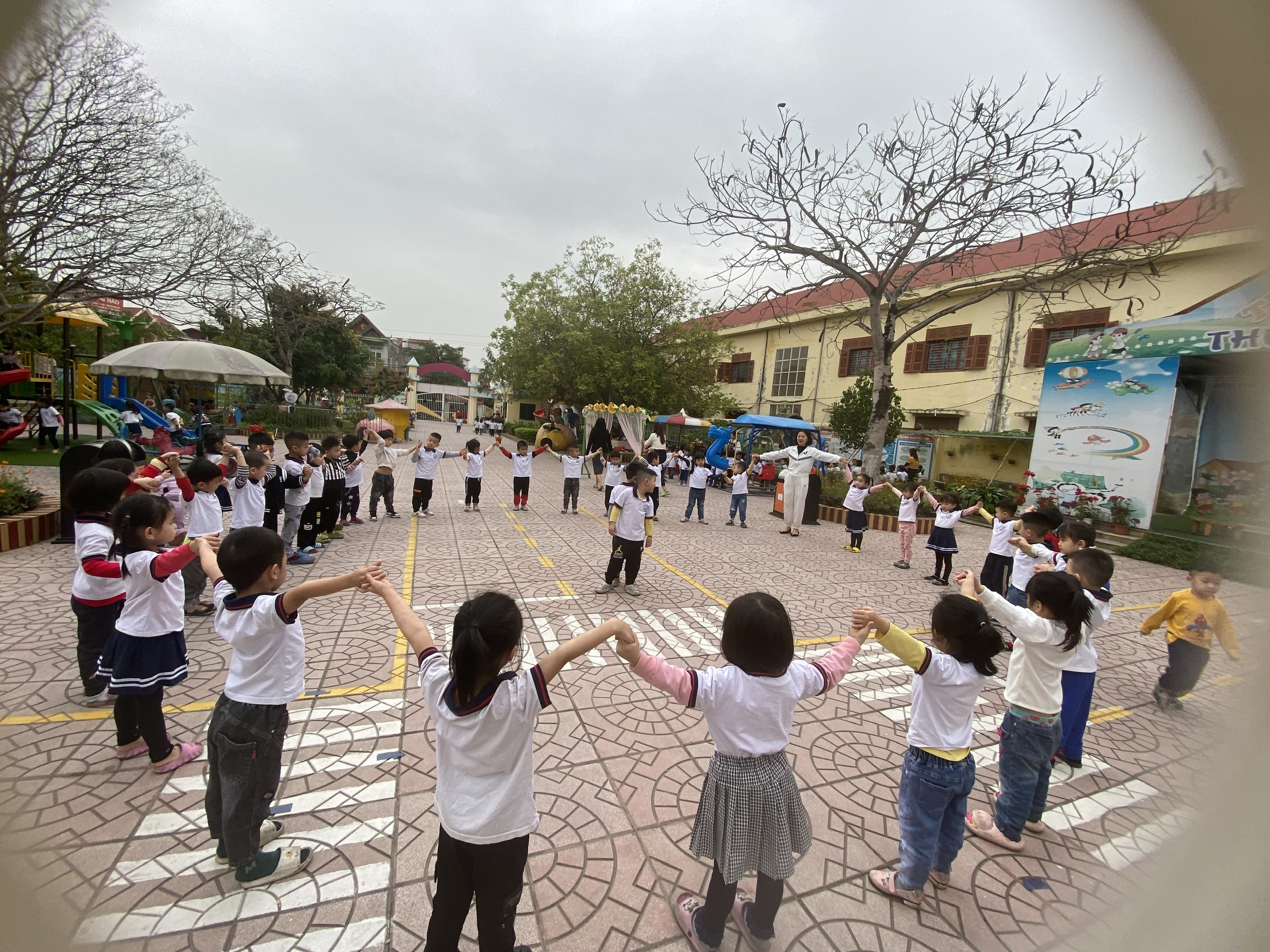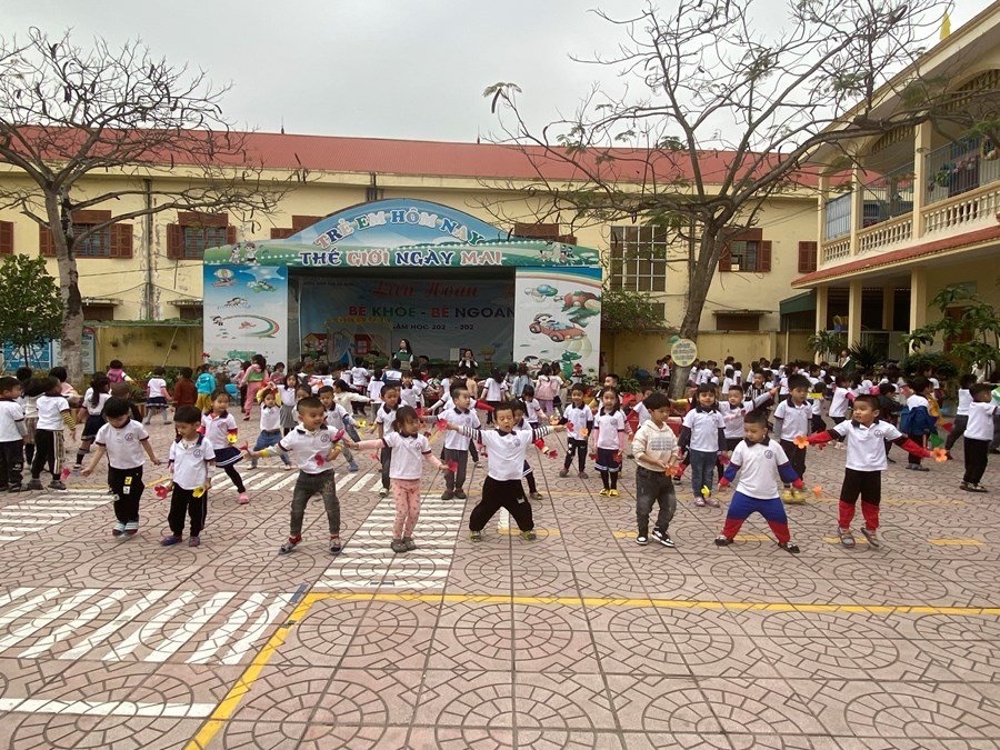 Khi đến trường các con được tập thể dục sáng cùng các bạn. Những động tác vận động thể dục vui nhộn sẽ khiến tinh thần tỉnh táo và tự tin bắt đầu một ngày mới với nhiều năng lượng tích cực hơn. Đồng thời cũng giúp các bé tăng sự nhạy bén, minh mẫm kích thích trí não hoạt động tốt hơn và tăng cường sự tập trung. Trẻ thường được thay đổi các hình thức tập thể dục như là tập với lời ca, tập với gậy, vòng, hoa, nơ, cờ…