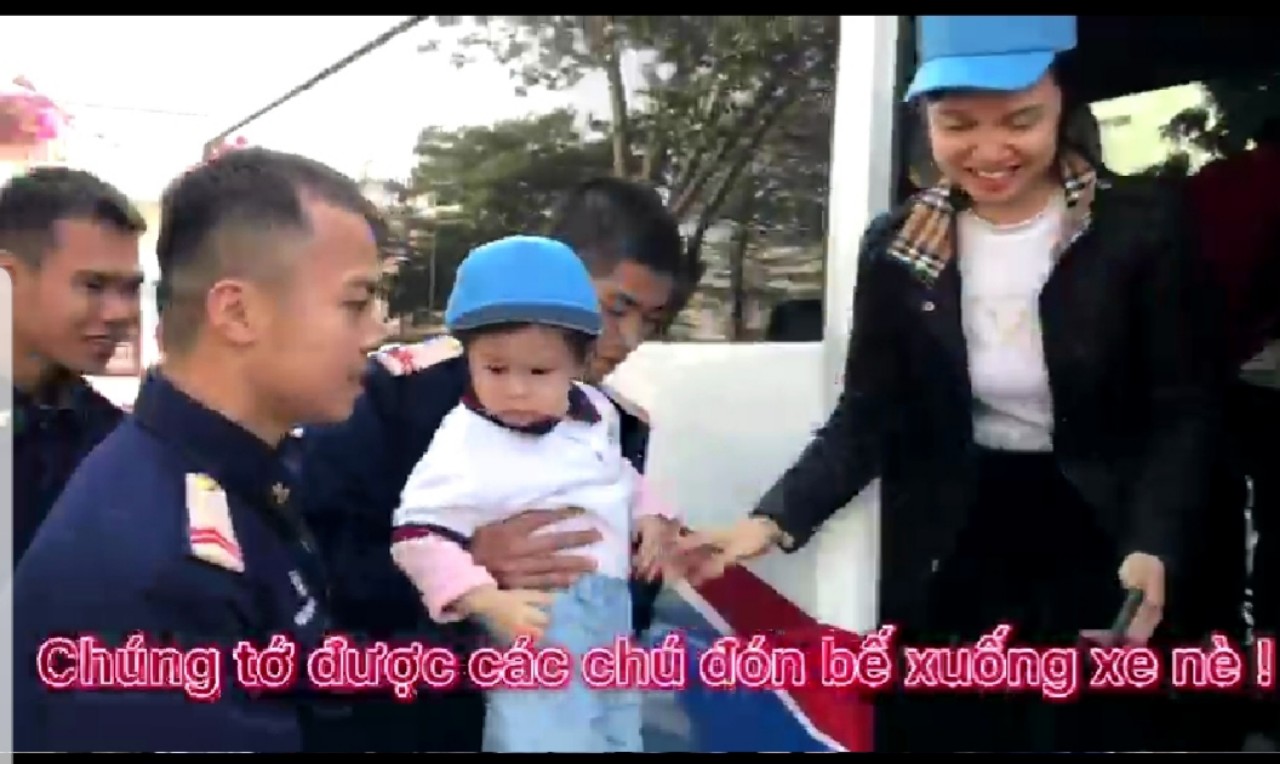 * Đến doanh trại bộ đội rồi! Xe vừa dừng lại các chú bộ đội niềm nở ra đón các con. các chú đón từng con xuống xe và không quên hỏi tên con, tên trường lớp để làm quen, các con thì chào hỏi các chú rất lễ phép.