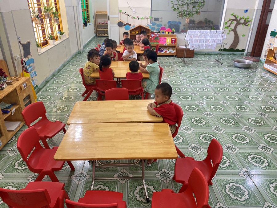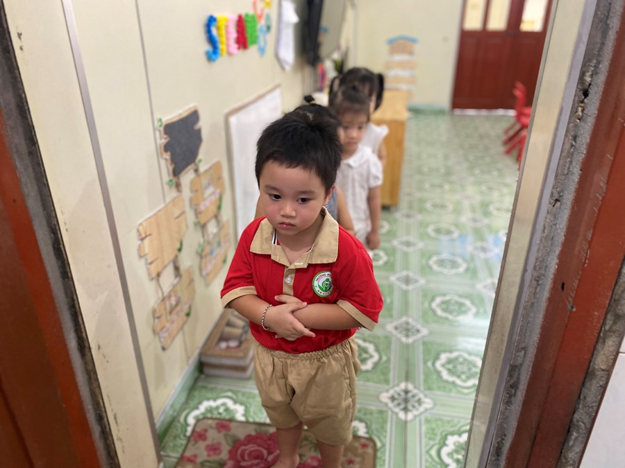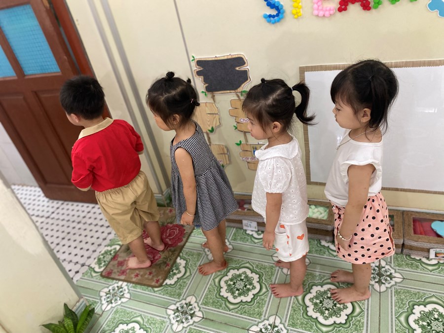 Chúng tỡ đang ngồi ngay ngắn để chờ đến lượt rửa tay ,rửa mặt