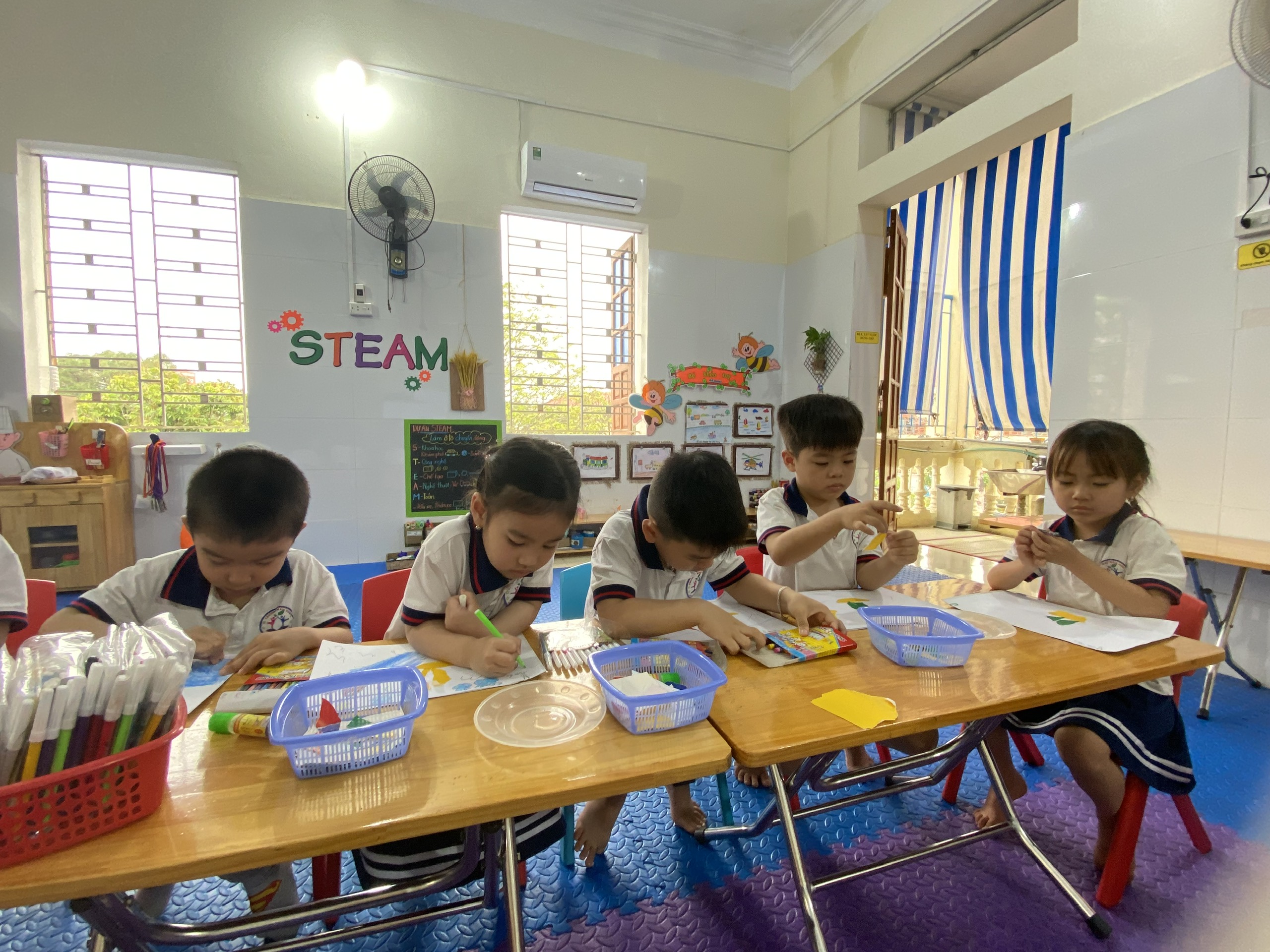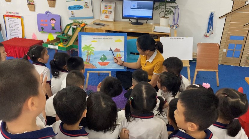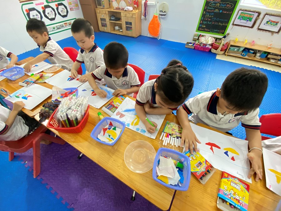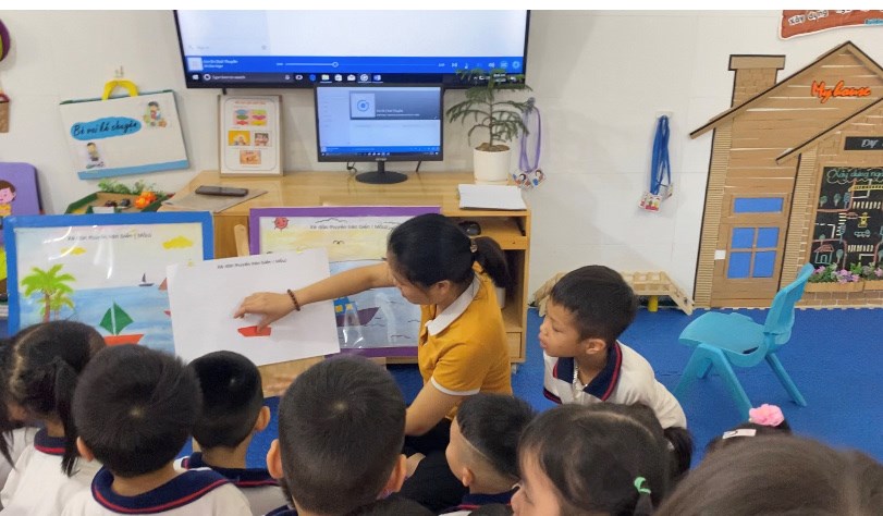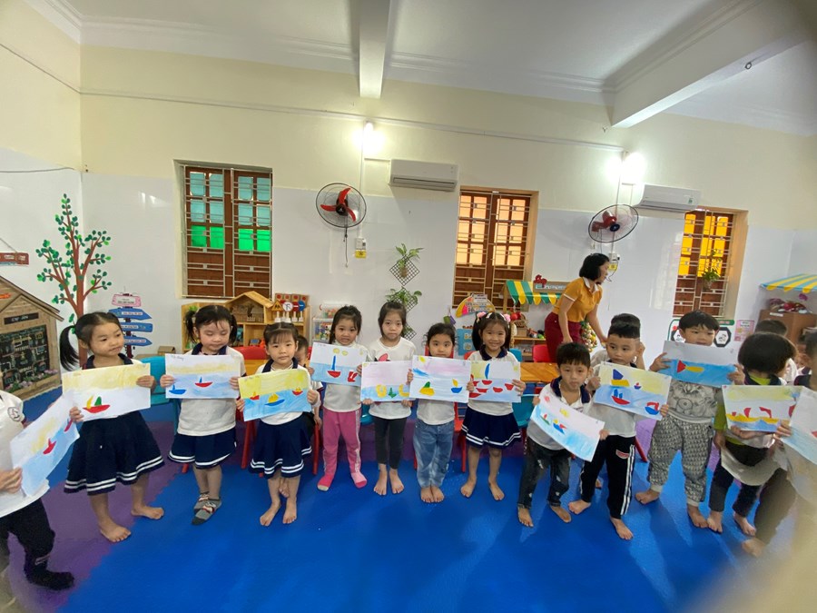 Cô giáo đang hướng dẫn cách xé dán thuyền cho chúng tớ đấy!