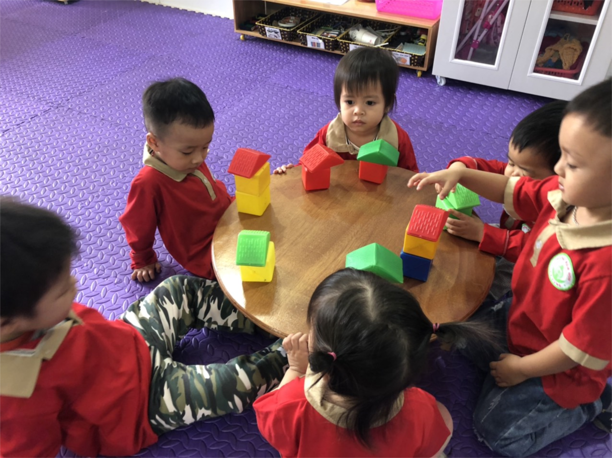 Dưới sự hướng dẫn của cô giáo, hôm nay các bé lớp Nhà trẻ số 1 tham gia hoạt động “Xếp ngôi nhà của bé”. Khi thực hiện “Xếp ngôi nhà” trẻ được cô giáo giới thiệu về các khối như: Khối vuông, khối tam giác và các biểu tượng màu sắc khác nhau như vàng, xanh, đỏ…Để trẻ xếp được ngôi nhà, cô hướng dẫn trẻ cầm khối vuông đặt xuống sàn làm tường nhà tiếp theo lấy khối tam giác xếp chồng khít lên khối vuông làm mái nhà, vậy là đã xếp được ngôi nhà 1 tầng. Để xếp ngôi nhà cao tầng, cô xếp chồng khít 2 hoặc 3 khối vuông lên nhau và sau đó cô xếp chồng khít khối tam giác lên để làm mái nhà, ngôi nhà cao tầng đã được xếp xong.