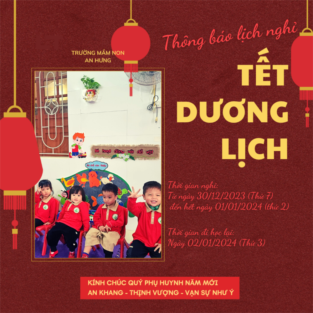 Thực hiện công văn số 250/PGDĐT ngày 18/12/2023 của Phòng GDĐT huyện An Dương về việc nghỉ Tết Dương lịch 2024. Trường Mầm non An Hưng thông báo lịch nghỉ Tết Dương lịch năm 2024 của Cán bộ giáo viên, nhân viên và học sinh như sau: