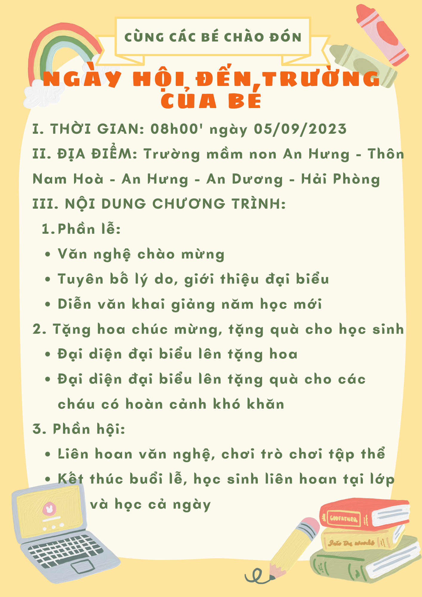 Địa điểm: Trường mầm non An Hưng - Thôn Nam Hoà - An Hưng - An Dương - Hải Phòng